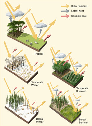 Illustration for peer-reviewed research depicting the varying balance of solar gain, heat transfer, and reflectance due to albedo depending on season and landscape.