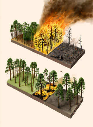Illustrated comparison of overstocked vs. thinned / managed forest in the face of spontaneous wildfire. The overstocked forest at top shows the typical / so-called "dog hair" density of small-diameter trees in a management scenario where all fires are suppressed and no thinning is carried out; this dense stock of fuel fosters "catastrophic" or "stand-replacing" wildfires as the flames spread easily through the crowns and canopy. The aftermath reveals a total destruction of the landscape.
