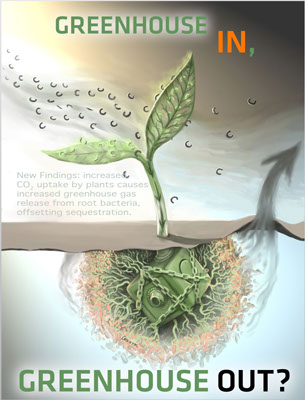 Press Release Illustration: new research shows that increased CO2 levels in the environment actually fuel further greenhouse gas emissions from root bacteria--the faster-growing plants "leak" more free sugars from roots, feeding soil bacteria metabolism which exhales methane and other gases.