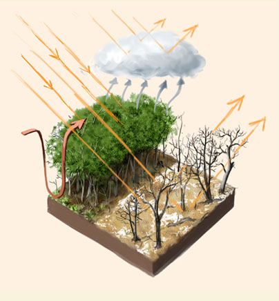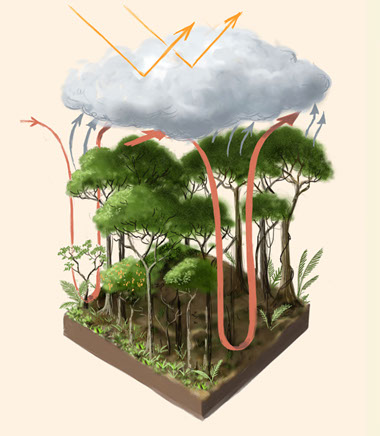 Illustration of "Roughness" (red vector) alongside factors of albedo and latent heat for a storied tropical forest.