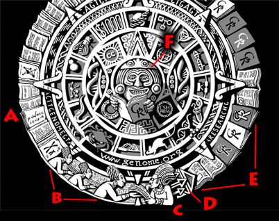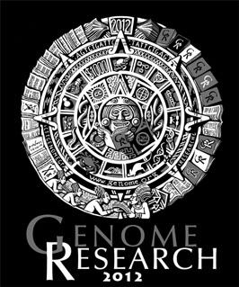 Illustrated design produced as a special conference T-shirt for the journal Genome Research in defiance of the then-predicted end of the world in 2012. Features a genomic-research version of the famous apocalypse-talisman itself, the Mayan Calendar, complete with its own cosmology (see next slide for details).