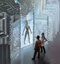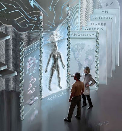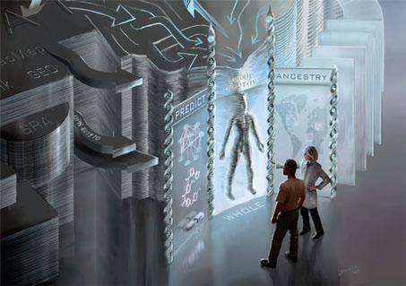 What is the point of Personal Genomics? The poster composition culminates in a "magic mirror" at the bottom before which the subject / patient stands, with explicating Genomic Counselor at his side. At center, the shifting stacks of summed genomic databases that loom behind converge to present a genomic portrait of the subject, an ever-updating profile that unifies what is known and understood of the individual's personal sequence. In the end, genomics can provide this comprehensive view, helping to predict and treat personal disease (the left mirror pane, "Therapy," showing a real "miracle" anticancer drug (imatinib) that was designed based on genetic understanding), trace personal ancestry through a worldwide human family (the right-hand pane), and more broadly lets one "Gnothi Sauton" (the Greek phrase over the central pane, which was also inscribed over the door to the famous Oracle of Delphi), meaning "know thyself," the same offer made silently by every mirror one visits.