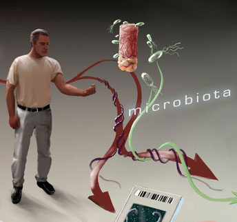 METAGENOMICS studies mixed samples of DNA extracted / recovered from a shared environment, such as soil, seawater, or even the microscopic zoo on the landscape of the human body to identify the kinds of players that are present on the stage. And with the recent advances in high-throughput DNA sequencing, metagenomics can be increasingly used to characterize the human microbiome of both normal and pathogenic flora to better understand disease states. In this detail from my work for the journal Genome Research, a man is about to meet the Pseudomonas bacteria of his antecubital fossa (green flagellated cells) once the column of tissue in his skin punch biopsy (not to scale at all) is analyzed. Part of a complex special poster sponsored by Roche: to see the whole beautiful thing, visit the Genome Research site here.
