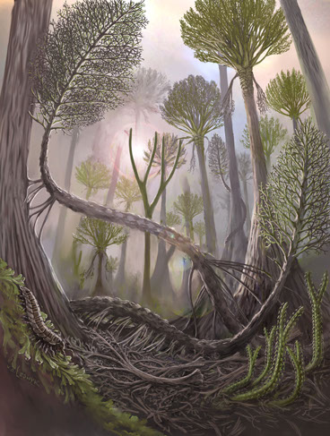 This sudden surge in plant height may have been a “race to the sun” as plants evolved more competitive shapes that helped them avoid the shade cast by close-growing neighbors. The tallest Gilboa “trees” were palmlike in shape, with lightweight, woodless trunks and many buttressing roots that made a conelike “foot” which propped the plants upright on solid ground. They left no modern descendants.