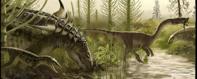 Above: from left, in a detail from the new Leshyk Mega-Mural, a small ground-running crocodylomorph (immediate crocodile ancestor) an aetosaur (Desmatosuchus), an early dinosaur (Coelophysis sp.), and a yet different aetosaur (Typothorax sp.) try to look busy for the camera.